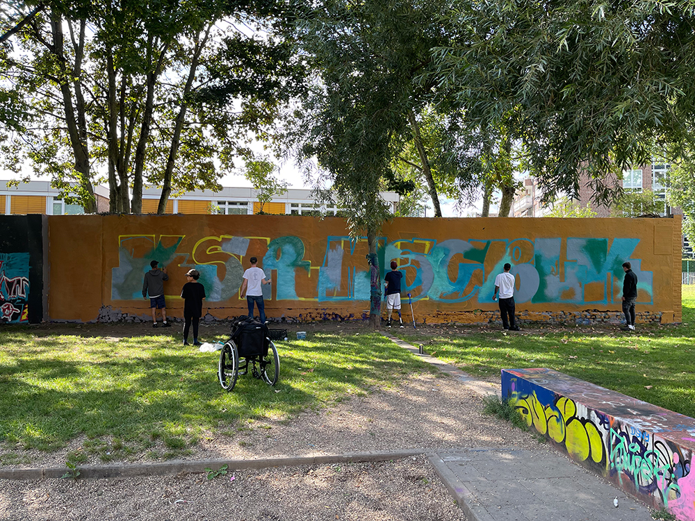 Nur die Rückseite der Schulwand ist legal! Das besprühen der Basketball-Fläche und Ausläufer ist nicht gestattet!